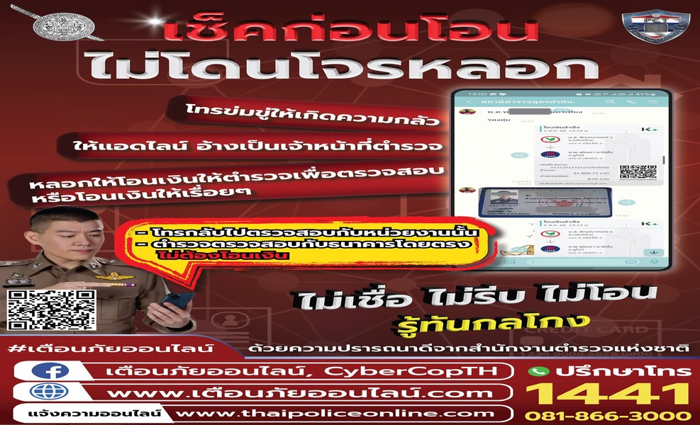 #ตำรวจไซเบอร์ #เตือนภัยออนไลน์ #แก๊งคอลเซ็นเตอร์ #หลอกให้โอนเงิน