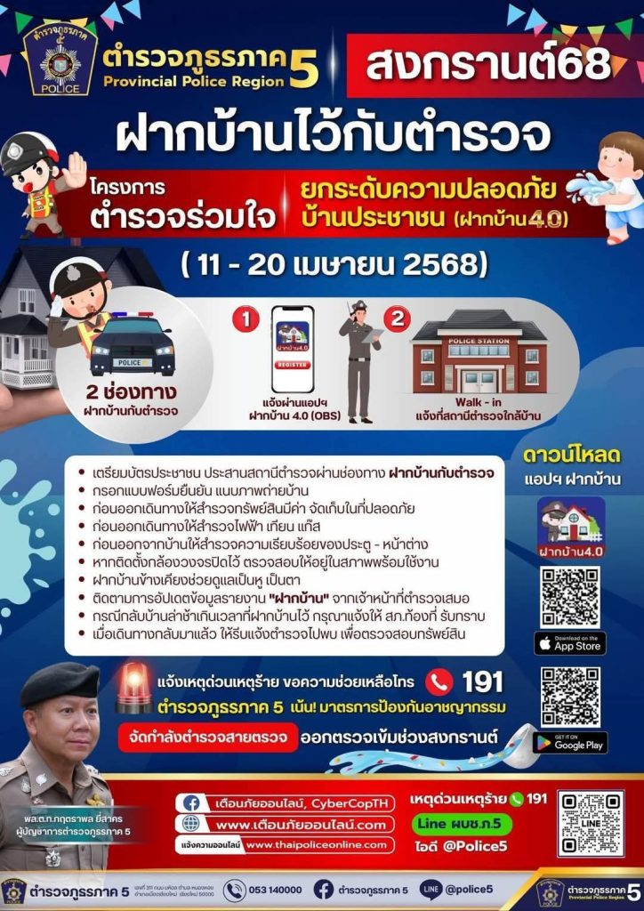 ประชาสัมพันธ์ โครงการฝากบ้านไว้กับตำรวจ 10 เมษายน 2568 โดย admin / ข่าวประชาสัมพันธ์,ข่าวประชาสัมพันธ์,ข่าวฝากประชาสัมพันธ์ แจ้งประชาสัมพันธ์พี่น้องประชาชนทุกท่านโครงการฯ ฝากบ้านไว้กับตำรวจ ช่วงสงกรานต์ 68ตั้งแต่วันที่ 11-20 เมษายน 2568ผ่านทางแอปฯ “ฝากบ้าน 4.0 (OBS)” และ Walk – in สถานีตำรวจใกล้บ้านท่าน Post Views: 33 Facebook iconFacebookTwitter iconTwitterLINE iconLine