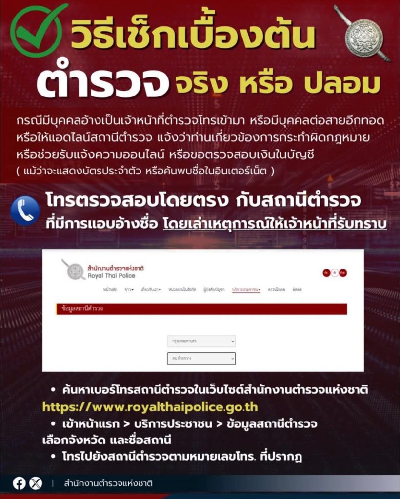 กรณีมีบุคคลอ้างเป็นเจ้าหน้าที่ตำรวจโทรเข้ามา หรือมีบุคคลต่อสายอีกทอด หรือให้แอดไลน์สถานีตำรวจ แจ้งว่าท่านเกี่ยวข้องการกระทำผิดกฎหมาย หรือช่วยรับแจ้งความออนไลน์ หรือขอตรวจสอบเงินในบัญชี ( แม้ว่าจะแสดงบัตรประจำตัว หรือค้นพบชื่อในอินเตอร์เน็ต ผ่าน search engine ต่าง ๆ เช่น google bing )