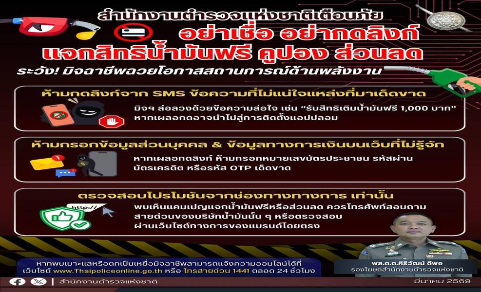 เตือนภัย มิจฉาชีพฉวยวิกฤตพลังงาน ส่งลิงก์หลอกแจกสิทธิเติมน้ำมันฟรี . วันนี้ (15 มีนาคม 2569) พล.ต.ต.