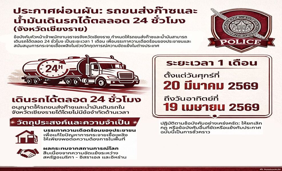 เชียงรายประกาศผ่อนผัน! ให้รถขนส่งก๊าซ-น้ำมัน วิ่งได้ 24 ชั่วโมง ตลอด 1 เดือนเต็ม เริ่ม 20 มี.ค. นี้