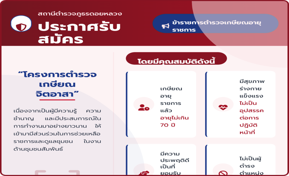 สถานีตำรวจภูธรดอยหลวง ประชาสัมพันธ์ รับสมัครข้าราชการตำรวจเกษียณจิตอาสา เพื่อสนับสนุน ภารกิจสำนักงาน