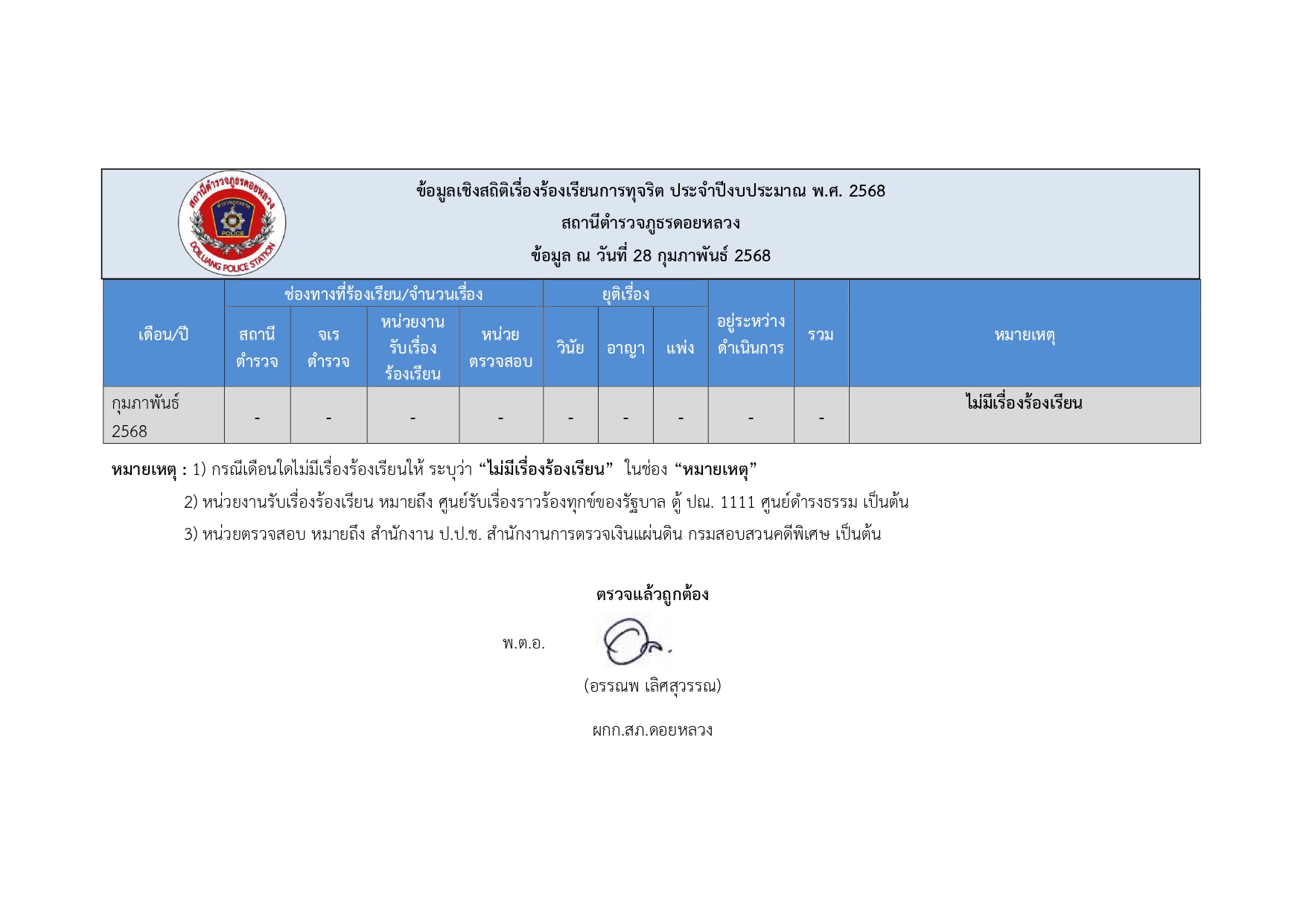 ข้อมูลสถิติเรื่องร้องเรียนประจำเดือน กุมภาพันธ์ 2568