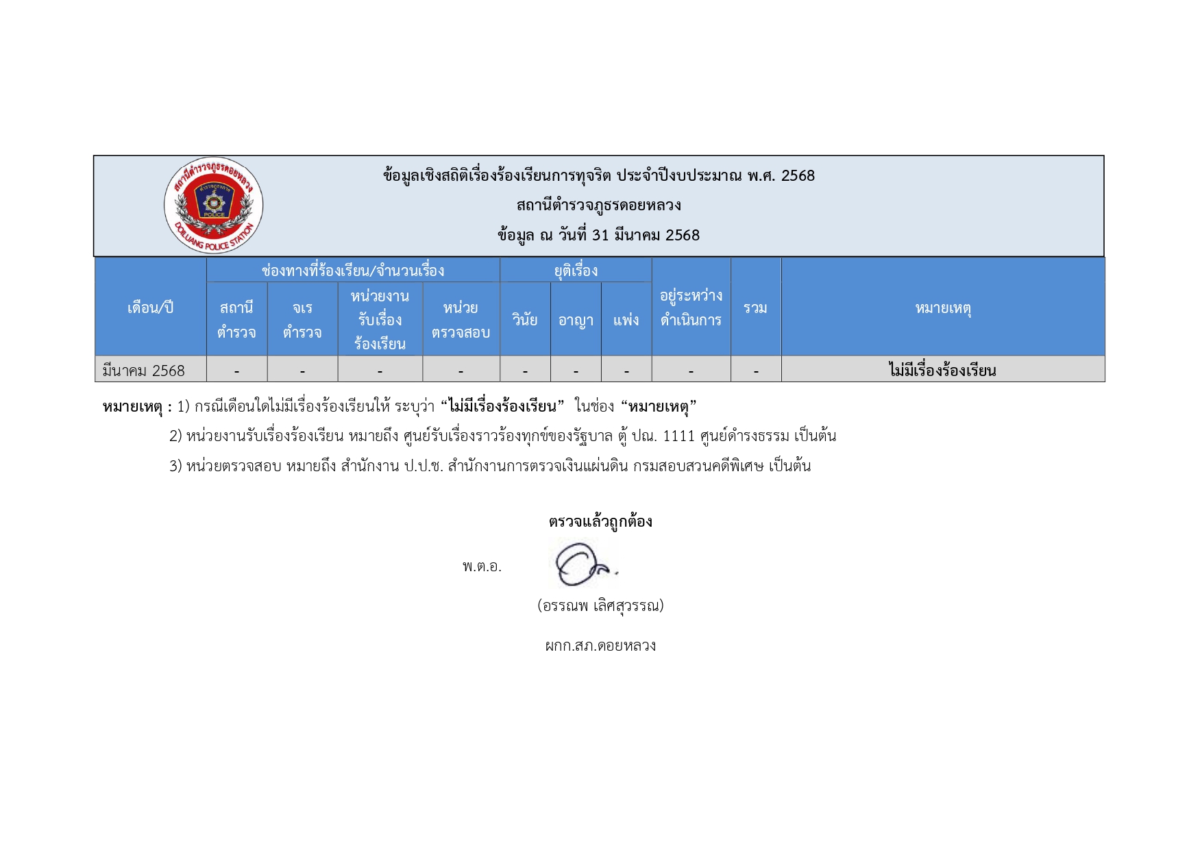 ข้อมูลสถิติเรื่องร้องเรียนประจำเดือน มีนาคม 2568